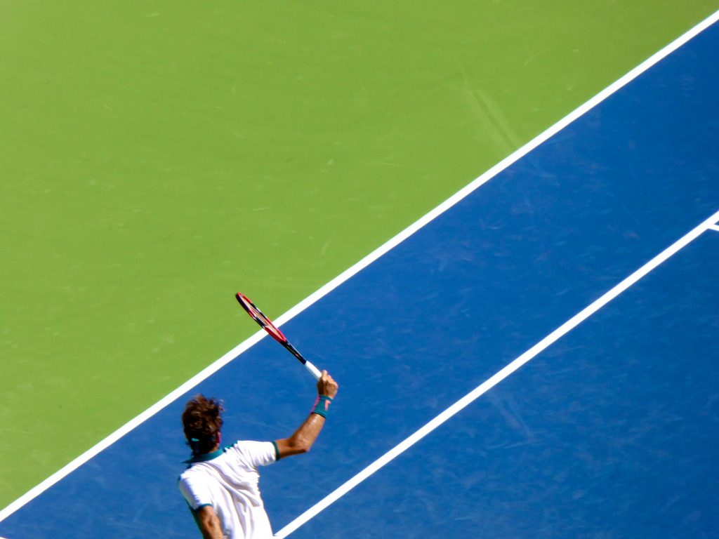 US Open 2016 – standing in the upper level of Arthur Ashe stadium. Being this high up I could shoot down for a more geometric flat background to the iconic Federer backhand.
